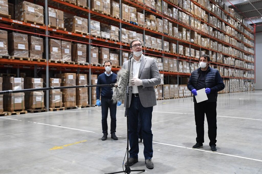 Predsednik Vučić u poseti magacinu medicinske opreme; Foto: Predsedništvo Srbije