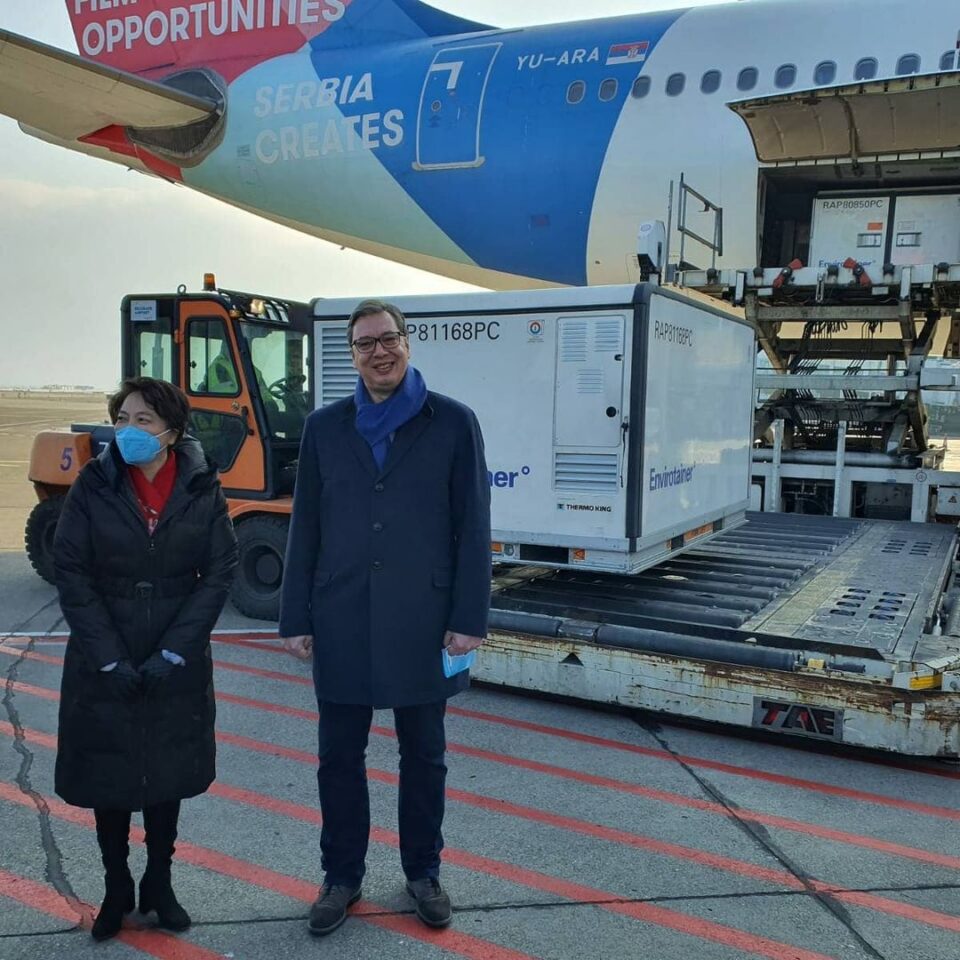 Predsednik Srbije i ambasadorka Kine u Srbiji dočekuju kineske vakcine; Foto: Instagram / avucic