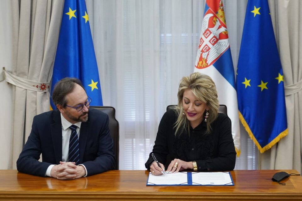 Ambasador Evropske unije u Srbiji Emanuele Žiofre uručio je danas ministarki za evropske integracije u tehničkom mandatu Jadranki Joksimović Sporazum o poveravanju, kojim je obezbeđeno „podmirenje dela troškova koji su nastali tokom krize javnog zdravlja nastale kao posledica pandemije“.