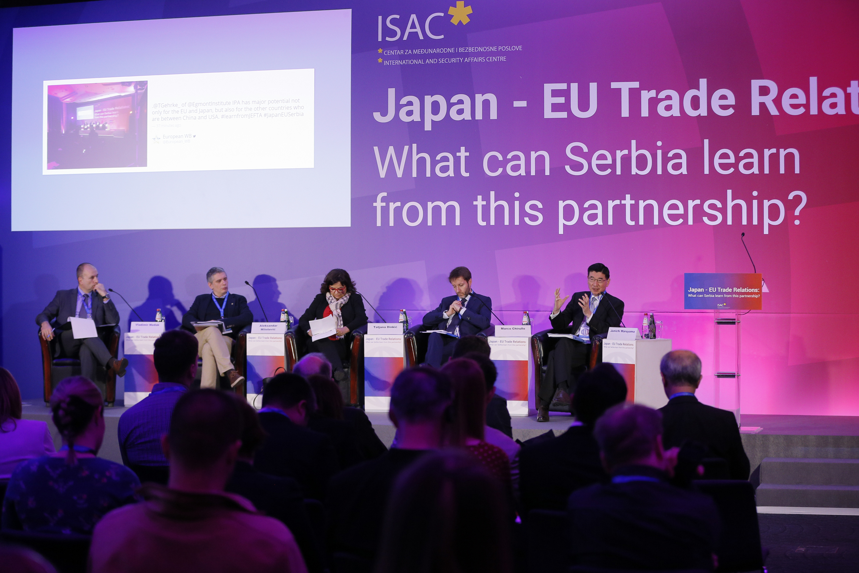 Na panelu je govorila i Tatjana Dinkić, šef radne grupe za poglavlje 30, u Ministarstvu trgovine, turizma i telekomunikacija. Kao maloj zemlji, bez slobodne trgovne Srbiji se uskraćuje da bude produktivna i konkurentna na tržištu. Prema rečima Tatjane Dinkić, Japan bi usled niske ekonomske saradnje sa Srbijom, koja je doduše u razvoju, jer velike japanske firme dolaze i investiraju, mogao to da iskoristi i preokrene u svoju korist, s obzirom da je Srbija geografski blizu EU, što bi za obe strane bilo značajno. Istaknuta je i važna činjenica da je Japan bilateralni najveći donor Srbije, posle Nemačke.
